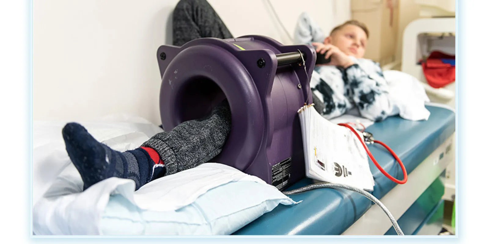 The expandable prosthesis can grow as a kid grows. Here, Nolan rests while a large magnet lengthens the prosthesis inside his leg.