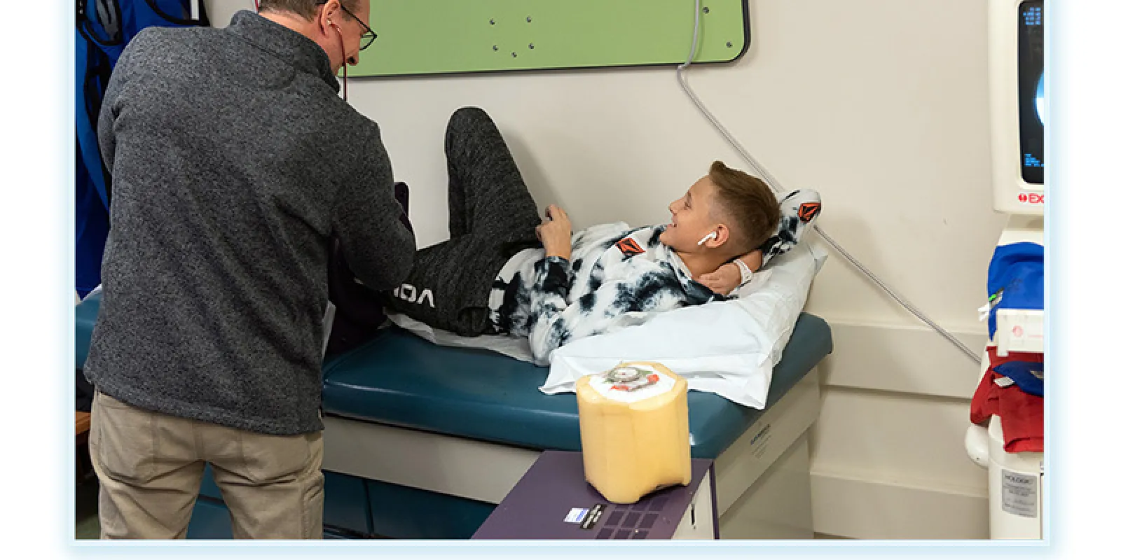 Nolan's dad listens through a stethoscope as Nolan's leg grows about 5 millimeters, about as long as a pencil is wide.